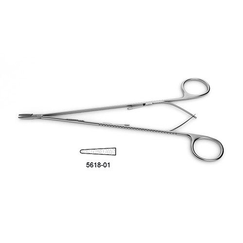 ring handle, jaw surfaces impregnated w/ fine tungsten carbide dust, straight jaws (use w/ 5-0 & smaller suture)